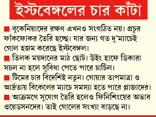 টিম সূত্রে খবর, ভারতে এসে পরিবেশের সঙ্গে এখনও মানিয়ে নিতে পারেননি এশিয়ান কোটার বিদেশি আমিরভ। ফলে বুধবার তাঁর প্রথম একাদশে থাকার সম্ভাবনা কম। এ দিন সকালে অনুশীলনে গোড়ালিতে সামান্য চোটও পেয়েছেন কিরঘিজস্তান স্ট্রাইকার। ফলে গত ম্যাচের টিমই অপরিবর্তিত থাকার সম্ভাবনা। এ দিন তিলক ময়দানে ইস্টবেঙ্গলকে ঘণ্টাখানেক প্র্যাকটিস করার জন্য ছেড়েছিলেন চার্চিল কর্তারা। কিন্তু বিপক্ষের ফুটবল-গোয়েন্দাদের চোখ এড়িয়ে মর্গ্যান প্র্যাকটিস সেরে নেন হোটেলের কাছের মাঠে। সেখানেই তিনি খবর পান চার্চিলের আদিল খান এবং ব্র্যান্ডন ফার্নান্ডেজের চোট রয়েছে। লিগ টেবলে এখনও পয়েন্ট না পাওয়া চার্চিল দলের কোচ অ্যালফ্রেড ফার্নান্ডেজ বলছেন, ‘‘ইস্টবেঙ্গলের মাস্ট উইন সিচুয়েশন হলে আমাদের কাছে এটা মাস্ট-নট-লুজ ম্যাচ। পয়েন্ট চাই-ই চাই।’’