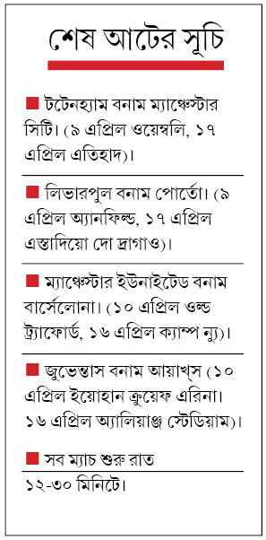 কোয়ার্টার ফাইনালে প্রিমিয়ার লিগের চার ক্লাব খেলেছিল এক দশক আগে। সূচি যা হল তাতে বার্সেলোনা-ম্যান ইউ ম্যাচে যে জিতবে, তারা সেমিফাইনালে খেলবে লিভারপুল-পোর্তো লড়াইয়ে বিজয়ীর সঙ্গে। তবে ধরেই নেওয়া হচ্ছে, সেমিফাইনালে খেলবে গতবারের ফাইনালিস্ট সাদিয়ো মানেদের ক্লাব।