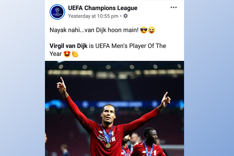 তাঁরা শুধু মাত্র উয়েফা প্লেয়ার অব দ্য ইয়ার ঘোষণা করেই থেমে থাকেনি। সেই পোস্টের ছবির ক্যাপশনে তাঁরা লেখে ‘নায়ক নেহি…ফান দাইক হু ম্যায়’। ১৯৯৩ সালে মুক্তি পায় বিখ্যাত বলিউড সিনেমা ‘খলনায়ক’। সেই সিনেমারই গানের লাইনের সঙ্গে ছন্দ মিলিয়ে তাঁরা এই ক্যাপশন তৈরি করে। ভারতীয় নেটিজেনদের মধ্যে সঙ্গে সঙ্গে দেখা যায় উচ্ছ্বাস।