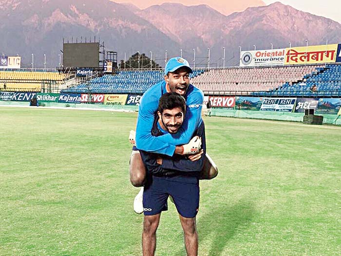 ফুরফুরে: বুমরার ঘাড়ে চেপে হার্দিক। ধর্মশালায়।