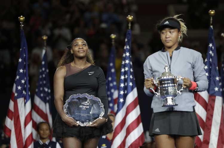 ইউএস ওপেন উইমেন্স সিঙ্গলস চ্যাম্পিয়নের ট্রফি হাতে নাওমি ওসাকা (ডান দিকে) এবং রানার্স ট্রফি হাতে সেরেনা। ছবি: এপি