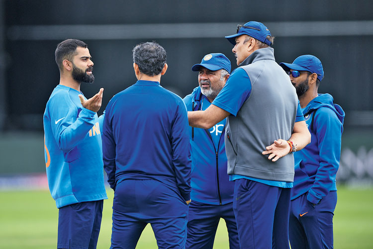 পরিবর্তন: সেই দল। শাস্ত্রীর ডান দিকে ফিল্ডিং কোচ শ্রীধর ও বোলিং কোচ অরুণ। কোহালির ডান দিকে বাঙ্গার। হয়তো ভাঙতে চলেছে এই জোট। ফাইল চিত্র