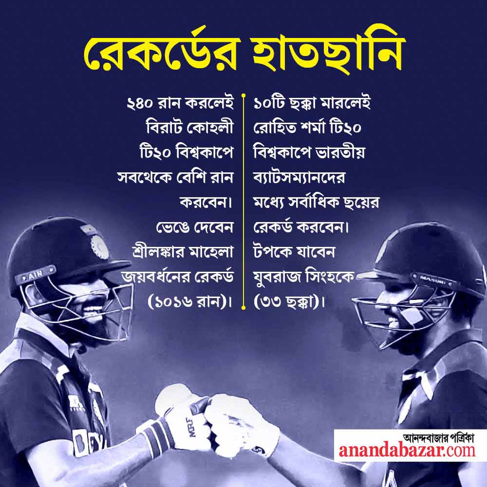 বিরাট কোহলীর মুকুটে অনেক পালক থাকলেও আইসিসি-র কোনও প্রতিযোগিতা না জেতার ক্ষত রয়েই গিয়েছে। এ বারের টি২০ বিশ্বকাপে সেই ক্ষত পূরণের চেষ্টা করবেন অধিনায়ক কোহলী। সেই সঙ্গে আরও একটি রেকর্ডের সামনে তিনি। শুধু কোহলী নন, রেকর্ডের সামনে রোহিত শর্মাও।