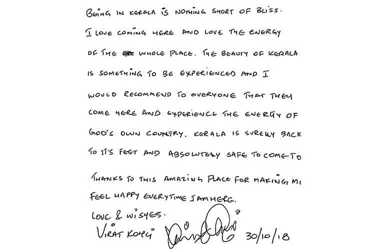 তবে বিরাট যে কেরলের সৌন্দর্যে মুগ্ধ, তা প্রকাশ করতে ভোলেননি। তাঁর নিজের হাতে লেখা এক বার্তা টুইটারে প্রকাশ করেন এ রাজ্যের পর্যটনমন্ত্রী কে সুরেন্দ্র, যাতে ভারত অধিনায়ক লিখেছেন, ‘‘কেরলের সৌন্দর্য মন ছুঁয়ে যাওয়ার মতো। এখানে এলে খুবই আনন্দ ও তৃপ্তি পাই। সবার এখানে একবার করে ঘুরে যাওয়া উচিত। বন্যাবিধ্বস্ত কেরল আবার ঘুরে দাঁড়িয়েছে। এখানে আসা পুরোপুরি নিরাপদ।’’