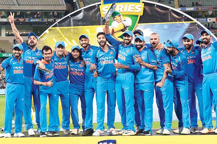 চ্যাম্পিয়ন: ঐতিহাসিক টেস্ট সিরিজ জয়ের পরে এ বার ওয়ান ডে সিরিজেও অস্ট্রেলিয়া-বধ কোহালিদের। শুক্রবার মেলবোর্নে জয়ের পরে উল্লাস ভারতীয় দলের। ট্রফি তুলে দেওয়া হল এ দিনই অভিষেক হওয়া বিজয় শঙ্করের হাতে। ছবি: এপি।