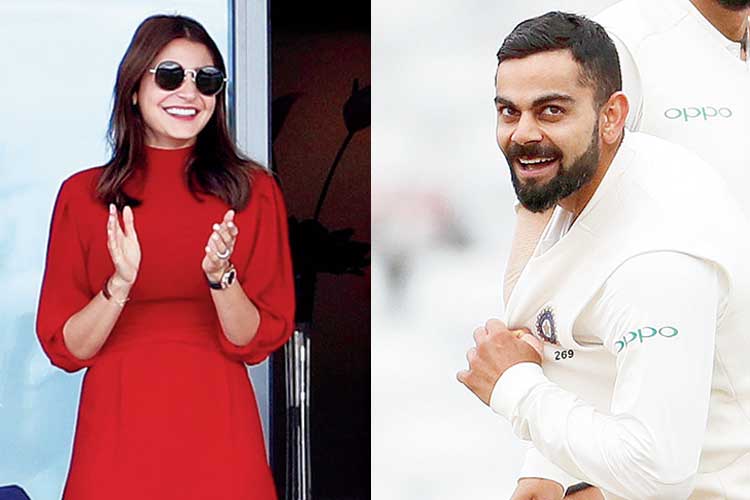 উচ্ছ্বাস: ট্রেন্ট ব্রিজ টেস্টে ২০৩ রানে জেতার পরে বিরাট কোহালির উৎসব। (বাঁ দিকে) গ্যালারিতে উল্লাস অনুষ্কার।