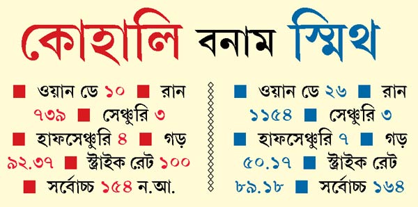 বিরাট এ বছর মাত্র দশটা ওয়ান ডে খেললেও এই ফর্ম্যাটে ও যে অন্যতম সেরা, তার প্রমাণ দিয়ে দিয়েছে। দশটার মধ্যে আটটা ইনিংসে ৪৫ বা তার বেশি করেছে। ভারতের হয়ে সফল রান তাড়া করতে নেমে ৫৯ ম্যাচে ওর গড় অবিশ্বাস্য— ৯০.১০। এর মধ্যে কুড়ি বার বিরাট নিজেই উইনিং শট নিয়েছে।