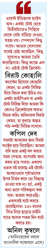 হাতে এত সময় পেয়েও সাবাইনা পার্ক টেস্ট না জেতায় ভারতের হতাশ হওয়াই উচিত। ভারতের ডিক্লেয়ারেশন নিয়ে প্রশ্ন উঠতে পারে। কিন্তু আমার মনে হয় বিরাট কোহালি যা করেছে, একদম ঠিক করেছে। বৃষ্টির উপর তো কারও নিয়ন্ত্রণ থাকে না। তা ছাড়া তার পরেও ভারতের হাতে যথেষ্ট সময় ছিল। কিন্তু ওয়েস্ট ইন্ডিজ যে ভাবে পাল্টা লড়াই দিল, অসাধারণ।
