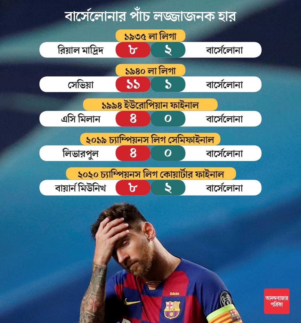 চার বছর পরের বিশ্বকাপে ব্রাজিলের ঘরের মাঠে জার্মানি ৭-১ গোলে চূর্ণবিচূর্ণ করে সেলেকাওদের। দুঃস্বপ্নের সেই রাত আজও ভোলেননি ব্রাজিলীয়রা। গত কাল রাতে বায়ার্ন মেসিদের ভেঙে চুড়ে শেষ করে দেয়। ৩১ মিনিটের মধ্যেই ৪-১! তখনই ম্যাচ পকেটে নিয়ে ফেলেছিল বায়ার্ন। নব্বই মিনিটের শেষে সেটাই হয়ে ৮-২। হাবাস বলছেন, ‘‘জার্মানদের অভিধানে রিল্যাক্স বলে কোনও শব্দ নেই। বার্সেলোনাকে দেখে কেমন যেন ছাড়া ছাড়া মনে হয়েছে।’’