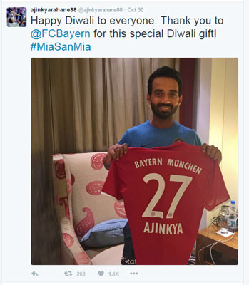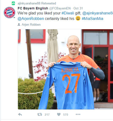 যদিও পাল্টা উপহার পাঠাতে ভোলেননি অজিঙ্ক রাহানেও। তিনি আবার তাঁর ভারতীয় দলের জার্সিই পাঠিয়ে দিলেন রবেনকে। ফুলহাতা সেই জার্সির পিঠে লেখা অজিঙ্ক ২৭। সেই জার্সি হাতে নিয়ে ছবি তুলে বায়ার্ন মিউনিখের পেজেই টুইট করলেন তারকা এই ফুটবলার। লিখলেন, ‘‘আমরা খুশি তোমার দিওয়ালি উপহার পেয়ে। খুব পছন্দ হয়েছে।’’