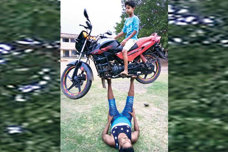 আজ পিছন ফিরে তাকালে তিনি নিজেই হতবাক হয়ে যান। স্কুল জীবনে কবাডি খেলার সময় তাঁর একটি হাঁটু ভেঙে যায়। তিনি বলেন, ‘‘সেই সময় ভেবেছিলাম, আর বুঝি কোনও খেলাধুলো করতে পারব না!’’ সেই ভাঙা হাঁটু জোড়া লেগেছে। মাটিতে শুয়ে সেই হাঁটুতে ভর দিয়ে পা দু’টিকে উপর দিকে তুলে ধরেন তিনি। সেই পায়ের উপর রাখা হয় কাঠের তৈরি গরুর গাড়ির চার চারটে চাকা। সেই পায়েই শূন্যে তুলে ধরা হয় আরোহী- সহ মোটর বাইক। তাঁর মাথার উপর কাঁচের গ্লাস, তার উপরে সাইকেলের রিম। সেই রিমের উপরে বসে থাকে কিশোর। এই রকম ব্যালান্সের খেলায় পারদর্শী তিনি ও তাঁর দল। দু’ চোখ ময়দা দিয়ে বন্ধ। তার উপরে পুরু কাপড়ের কয়েকটি পাক দিয়ে বাঁধা হয়েছে। সামনে শুয়ে আছেন এক জন। চোখ বাঁধা অবস্থায় শুয়ে থাকা লোকের শরীরের চার পাশে নিখুঁত ভাবে ছোরা গাঁথার খেলায় তিনি ও তাঁর দলের সদস্যেরা দক্ষ। কাঁধে, মাথায়, হাতে ৮-১০ জনকে তিনি ঝুলিয়ে রাখতে পারেন।