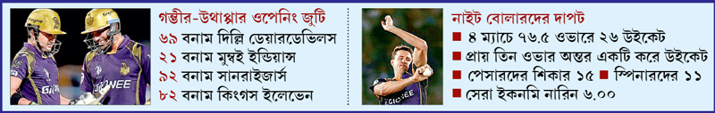গৌতম গম্ভীর আর রবিন উথাপ্পার ওপেনিং জুটিকে দেখে এটাই মনে হচ্ছে। এত দিন ধরে একসঙ্গে খেলতে খেলতে ওদের মধ্যে এখন আর কোনও কথাবার্তা বলতে হয় না। উথাপ্পা জানে, গম্ভীর কী করবে। গম্ভীর জানে উথাপ্পারটা। এই যে টানা চারটে ম্যাচ ধরে ওদের ওপেনিং জুটিকে নড়াতে বিপক্ষ হিমসিম খেয়ে যাচ্ছে, কেন জানেন? কারণ, ওরা রিস্ক ফ্রি ক্রিকেট খেলছে। পাওয়ার প্লে-তে ঝুঁকি নেওয়ার ব্যাপারটাই তুলে দিয়েছে। প্রথম ছ’ওভারে গম্ভীর বা উথাপ্পাকে দেখবেন না, ঝুঁকি নিয়ে কোনও শট খেলতে। সব ক্রিকেটীয় শট খেলছে। বাউন্ডারির দিকে বেশি না গিয়ে চলে যাচ্ছে সিঙ্গলস বা টু’জ-এ। ছ’ওভারে ঠিক চল্লিশ তুলে দিচ্ছে আবার উইকেটও পড়ছে না। এ বারের আইপিএলে ডট বল সবচেয়ে কম খেলছে গম্ভীর-উথাপ্পা জুটি। আর একদমই ঝুঁকির রাস্তায় না যাওয়ায় বিপক্ষ বোলাররা মোটামুটি দিশেহারা হয়ে যাচ্ছে ওদের আউট করা নিয়ে।