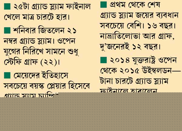 সে দিক দিয়ে তো দ্বিতীয় সেটে মুগুরুজার ১-৫ থেকে সেরেনাকে পরপর দু’বার ব্রেক করে ৪-৫ করা যথেষ্ট কৃতিত্বের। দশম গেমে নিজের সার্ভিসে প্রথম পয়েন্টেই ডাবল ফল্ট করাটাই ম্যাচের টার্নিং পয়েন্ট। ওই সময় মুগুরুজা ৫-৫ করতে পারলে খেলাটার শেষমেশ কী পরিণতি হত, নিশ্চিত নই। তখন কিন্তু সেরেনাকে একটু টেনস্ড দেখাচ্ছিল। কিন্তু সুপার চ্যাম্পিয়ন তো! মোক্ষম সময়ে বিপক্ষের ডাবল ফল্টের সুযোগ নিয়ে ব্রেক করে চ্যাম্পিয়নশিপ পয়েন্ট তুলে নিল।