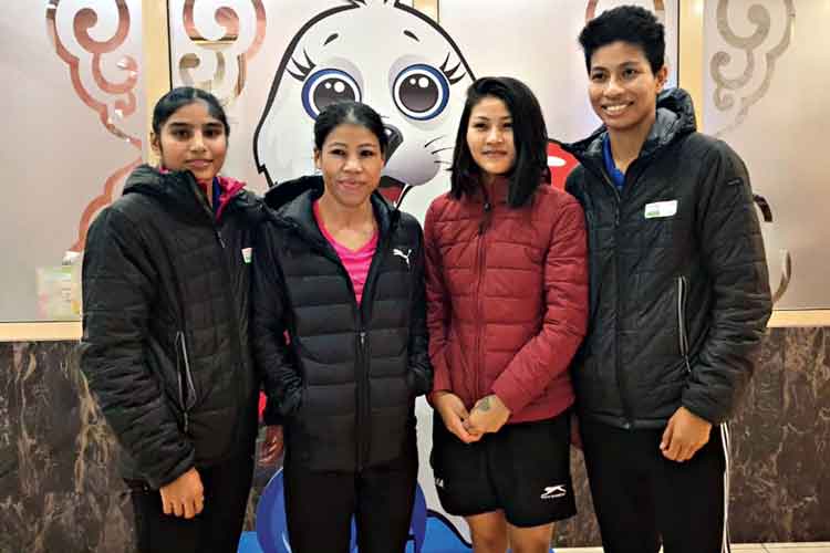 প্রত্যয়ী: সেমিফাইনালে ওঠা চার ভারতীয় বক্সার। (বাঁ দিক থেকে) মঞ্জু রানি, মেরি কম, যমুনা বোড়ো ও লভলিনা বড়গোঁহাই। বৃহস্পতিবার।