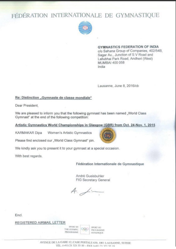 রিও অলিম্পিক্সের আসরে নেমে পড়ার আগে আত্মবিশ্বাসটা যেন এক ধাক্কায় বেড়ে গেল অনেকটাই। তিনি জিমন্যাস্ট দীপা কর্মকার। হঠাৎই এল সুসংবাদ। যা হয়তো এত দ্রুত স্বপ্নেও ভাবেননি আগরতলার মেয়ে। কিন্তু বিশ্ব জিমন্যাস্টিক ফেডারেশনের একটা চিঠিই ভারতীয় জিমন্যাসটিক্সকে পৌঁছে দিল একটা উচ্চতায়। অতীতে এমন সম্মান পাননি কোনও ভারতীয় জিমন্যাস্ট।বিশ্বমানের জিমন্যাস্ট হয়ে নিজের সঙ্গে সঙ্গে দেশকেও সেই বিরল সম্মান এনে দিলেন দীপা। জিমন্যাসটিক্স ফেডারেশন অফ ইন্ডিয়ার কাছে এই সার্টিফিকেটটি ই-মেলের মাধ্যমে পাঠিয়ে দেয় আন্তর্জাতিক জিমন্যাসটিক ফেডারেশন।