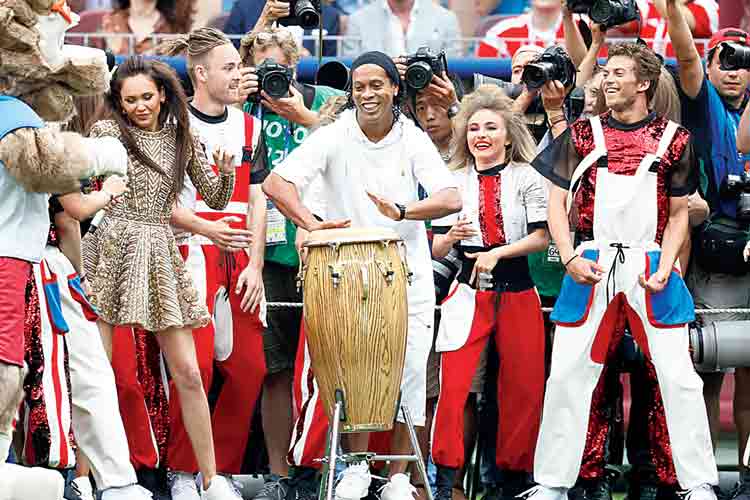 সমাপ্তি অনুষ্ঠানে দেখা গেল রোনাল্ডিনহোকে। বক্সে হাজির গতির রাজা ইউসেইন বোল্ট। ছবি: রয়টার্স
