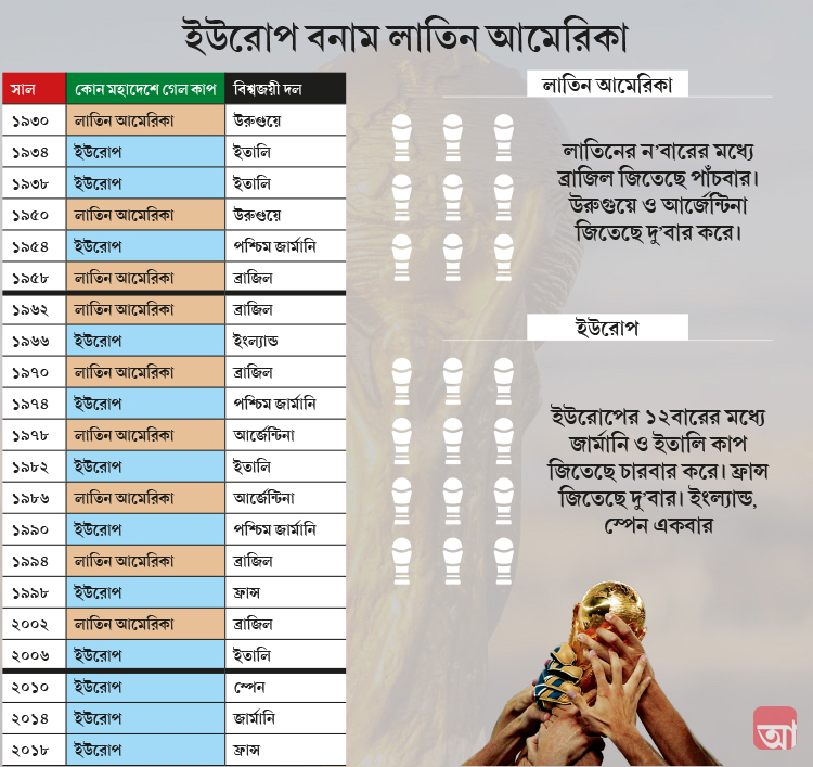 কিন্তু,লাতিনের কাপ জেতার মতো দল বলতে তো সেই ব্রাজিল আর আর্জেন্টিনা। তাও নীল-সাদা জার্সিধারীদের কাপ জয়ের ৩২ বছর বয়ে গিয়েছে. উরুগুয়ে অনেক বছর ধরেই কাপ জেতার দাবিদার হিসেবে চিহ্নিত হয় না। শেষবার বিশ্বকাপ জিতেছে ৬৮ বছর আগে. তুলনায়, ইউরোপে কাপের দাবিদার অনেক। জার্মানি-ইতালি ছাড়াও ফ্রান্স-স্পেন-ইংল্যান্ড রয়েছে বিশ্বজয়ীর তালিকায়। নেদারল্যান্ডস চ্যাম্পিয়ন না হলেও বরাবরই বড় শক্তি। মস্কোর লুঝনিকি স্টেডিয়ামে ফাইনালে লড়ে হারল ক্রোয়েশিয়া। রাশিয়া বিশ্বকাপে বেলজিয়াম হল তৃতীয়।