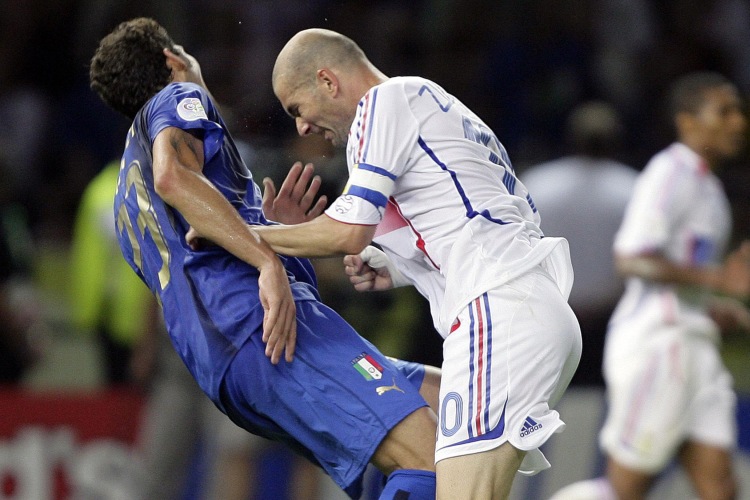 ২০০৬ বিশ্বকাপ ফাইনালে ইতালির মাতেরাজ্জিকে জিদানের ঢুঁসো। ফাইল ছবি।