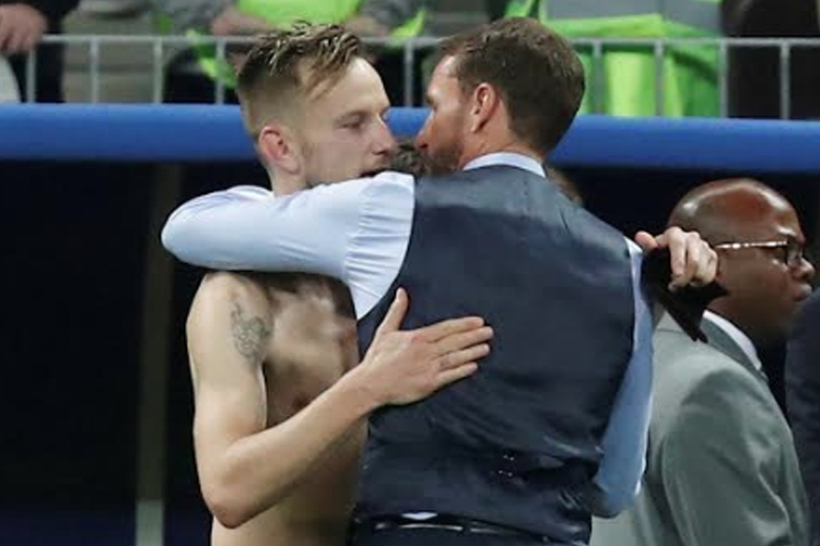 ফাইনালে ওঠার পর ইংল্যান্ডের ম্যানেজার সাউথগেটের সঙ্গে খালি গায়ে রাকিতিচ। ছবি: রয়টার্স।