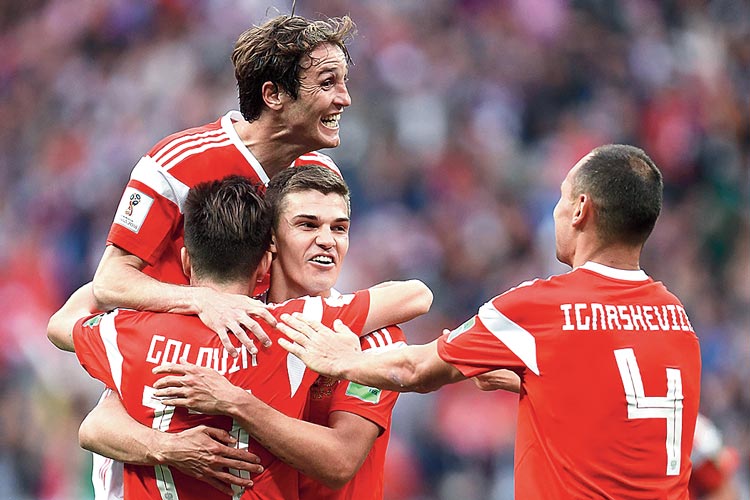জয়োল্লাস: বৃহস্পতিবার মস্কোয় সৌদি আরবকে পাঁচ গোলে হারিয়ে টিম রাশিয়া। ছবি: এএফপি