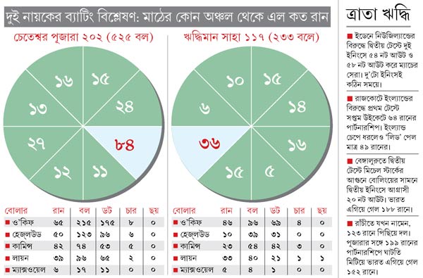 চেতেশ্বর পূজারার সঙ্গে ঋদ্ধির পার্টনারশিপটা দেখতে দেখতে ২০০১ মার্চের ইডেনও মনে পড়ে যাচ্ছিল। সে দিন ভিভিএস লক্ষ্মণ আর রাহুল দ্রাবিড় সারা দিন ধরে ব্যাট করে অকল্পনীয় জয়ের রাস্তা তৈরি করেছিল। রবিবার পূজারা-ঋদ্ধি দু’টো সেশন অপরাজিত থেকে এই ম্যাচটাও ঘুরিয়ে দিল।