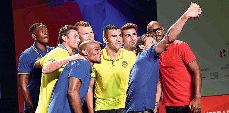 সেলফিতে নিজেদের ধরছেন আইএসএল তারারা। মুম্বইয়ে শনিবার।