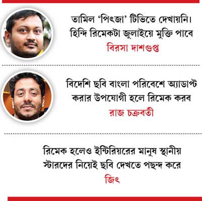 এ দিকে বাংলা রিমেক ছবির বাজেট যদি কেউ রিস্ক নিয়ে বাড়িয়েও ফেলেন, সেই ইনভেস্টমেন্টটা রিকভার করার মতো বড় মার্কেট এখনও তৈরি হয়নি। তাই প্রোডাকশন ভ্যালুর উন্নতির জন্য বাজেট বাড়ানোর স্ট্রাটেজিটাও সে ভাবে খাঁটবে না। বাকি থাকল আইডিয়া আর অ্যাডাপ্টেশনের জোর। পরিচালকরা মনে করছেন এমন ভাবে ছবিটা তৈরি করতে হবে, যাতে মনেই হয় না তামিলনাড়ুর কোনও গ্রামের গল্প দেখানো হচ্ছে। অনেকটা ‘সিটিলাইটস্’ যেভাবে ব্রিটিশ-ফিলিপিনো ছবি ‘মেট্রো ম্যানিলা’র থেকে অ্যাডাপ্ট করা হয়েছে। অরিজিনাল না দেখলে গল্পটা রাজস্থানের একটা গ্রামেরই মনে হবে।