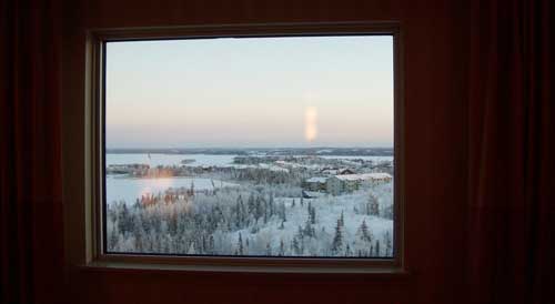 ওয়েস্ট জেট এয়ারলাইনসের উড়ান ধরে প্রায় দশ ঘণ্টার যাত্রায় ওটাওয়া থেকে ইয়েলোনাইফ পৌঁছলাম যখন, সন্ধ্যা তখন নেমে এসেছে। মজার ব্যাপার, ইয়েলোনাইফ উত্তর মেরুর খুব কাছে হওয়ার দরুন জানুয়ারি মাসে সূর্যোদয় হয় সকাল ১০টায় আর সূর্যাস্ত হয় দুপুর সাড়ে ৩ টেয়। সুতরাং দিনের দৈর্ঘ্য শুধু মাত্র সাড়ে ৫ ঘণ্টার মতন। কিন্তু গরম কালে (জুন-জুলাইতে) আবার সূর্যোদয় হয় ভোর পৌনে ৪ টে থেকে ৪ টের মধ্যে, আর সূর্যাস্ত হয় রাত প্রায় সাড়ে ১১ টায়। সুতরাং তখন দিনের দৈর্ঘ্য থাকে প্রায় ২০ ঘণ্টা। তাই ইয়েলোনাইফকে ‘ল্যান্ড অব মিডনাইট সান’ বা ‘মধ্যরাত্রিকালীন সূর্যের দেশ’ও বলা হয়। ইয়েলোনাইফের এয়ারপোর্টটিও অত্যন্ত ছোট, কিন্তু সাজানো-গোছানো, সুন্দরই মনে হল। বিমান থেকে নামতেই প্রচণ্ড ঠান্ডা অনুভব করলাম। নাকে ঠান্ডা হাওয়া ঢুকে পড়ায় এক অদ্ভুত রকম অস্বস্তি হচ্ছিল। মনে হচ্ছিল, বরফের কুচি যেন ঢুকে যাচ্ছে নাকের ভেতর। ঠান্ডার চোটে চোখ থেকে জল বেরিয়ে আসছিল। আবার সেই জল চোখের নীচেই জমে যাচ্ছিল বরফ হয়ে। আর তাতে চোখের পাতা পড়ে আটকে যাচ্ছিল! রীতিমতো চোখের পেশির ব্যায়াম করতে হচ্ছে। ইয়েলোনাইফ দারুণ ঠান্ডা জায়গা। জানুয়ারিতে তাপমাত্রা থাকে মাইনাস ৩০ ডিগ্রিরও নীচে। যদিও রাতে সেটা আরও অনেক নীচে চলে যায়। অথচ অরোরা দেখতে এই রাতেই বেরোতে হবে আমাকে।