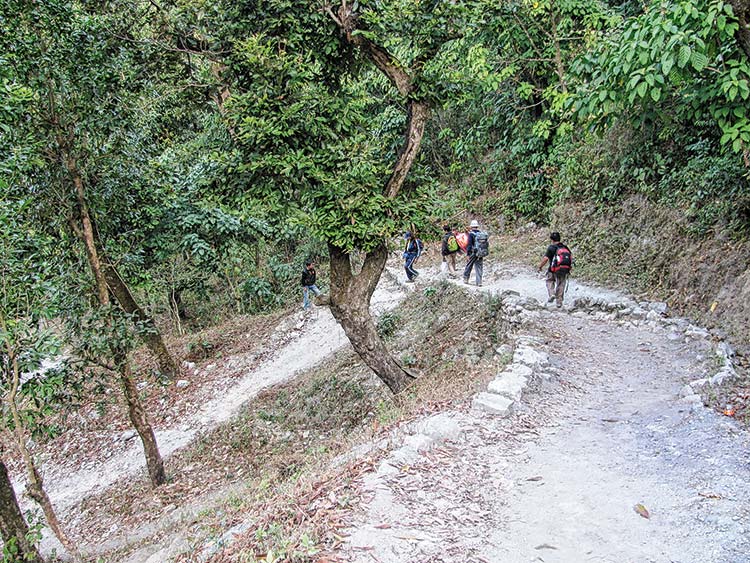 এখান থেকে রোভার্স ভিউ পয়েন্ট আরও চার কিলোমিটার হাঁটাপথ। ধীরে ধীরে গ্রাম ছাড়িয়ে জঙ্গলের মধ্যে প্রবেশ করলাম। চেস্টনাট, শাল, সেগুন, বাঁশের ঘন জঙ্গল। চলতে চলতে যথারীতি আমার গতি বেড়ে গেল। মোবাইলে গান শুনতে শুনতে সঙ্গীদের ছাড়িয়ে আমি বেশ খানিকটা এগিয়ে গেলাম। আর তখনই নিস্তব্ধতা ভেঙে দু’পাশের জঙ্গল থেকে বিচিত্র রকমের আওয়াজ ভেসে আসতে লাগল আমার কানে। এক অজানা ভয় চেপে বসল মনে। হয়তো যে কোনও সময়ে জঙ্গল থেকে বেরিয়ে আসতে পারে বুনো শুয়োর, লেপার্ড বা ভল্লুক। পড়িমড়ি করে ছুট লাগালাম সঙ্গীদের কাছে। আমাকে ও ভাবে ছুটে আসতে দেখে গাইড প্রকাশ কারণ জিজ্ঞেস করল। সব শুনে মুচকি হেসে নিদান দিল সকলকে এক সঙ্গে চলার। গহন অরণ্যের মধ্য দিয়ে ক্রমে আমরা উঠে এলাম রোভার্স ভিউ পয়েন্টে। উচ্চতা চার হাজার ফুট। এখান থেকে দূরের লেপচাখা, অংচুলুং, তাসিগাও, বক্সা, চুনাভাটি নজরে আসছে। এই ভিউ পয়েন্টের সমতলভূমিতে বসে সারা হল নাস্তা। এই পথে আরও দশ কিলোমিটার দূরে সিনচু লা পেরিয়ে রূপম উপত্যকা। এটা একটা বহু পুরনো রেশমপথ। আগে ভুটানের যাতায়াত ছিল এই পথেই। গহন অরণ্য, সবুজ ভুটান পাহাড়, ভুটান-বাংলা সীমান্তে এ পথের শেষ গ্রাম তাসিগাও ছেড়ে আমরা ফিরে চললাম লেপচাখার পথে।