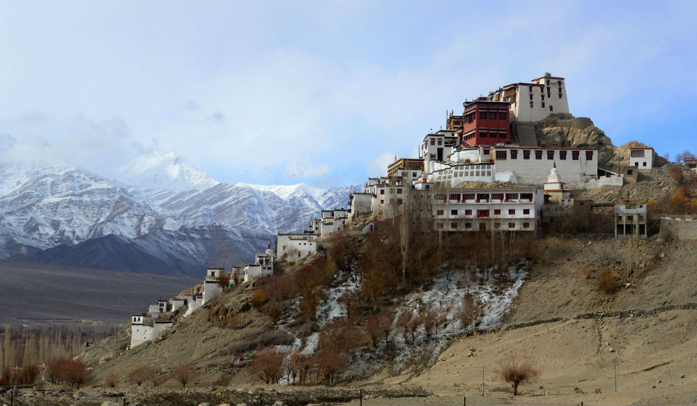 শ্যে দেখে গাড়ি চেপে এগিয়ে যেতে হবে আরও ৫ কিলোমিটার দূরে থিকসে গুম্ফা দেখতে। এই অঞ্চলের সম্ভবত সব থেকে সুন্দর ও বিস্তৃত এই গুম্ফাটিকে দেখা যায় পৌঁছবার বেশ খানিকটা আগে থেকেই পাহাড়ের মাথায়। একটি ছোট পাথুরে পাহাড়ের ওপর ধাপে ধাপে ঘর-বাড়ি দিয়ে সাজানো অদ্ভুত সুন্দর এর দৃশ্য। একটি ছোট গ্রামই যেন গড়ে উঠেছে ছোট পাহাড়টিকে ঘিরে। একেবারে উপরে রয়েছে ত্রিস্তরবিশিষ্ট গুম্ফা, অধিষ্ঠিত রয়েছেন বুদ্ধ। সামনে গাড়ি দাঁড় করিয়ে পায়ে হেঁটে চড়াই ভেঙে গ্রামের ভেতর দিয়ে পৌঁছন যায় গুম্ফার প্রধান দরজায়, কষ্টসাধ্য এই পথের বদলে পাশের পথ দিয়ে সোজা গাড়ি চেপেও পৌঁছনো যায় সেখানে। ভেতরে প্রাচীন মন্দির, প্রার্থনাকক্ষ ও লামাদের আবাসস্থল। মূল গর্ভগৃহতে সোনালী রঙের মৈত্রেয় বুদ্ধর সুবিশাল উপবিষ্ট মূর্তি অদ্বিতীয়। ওপরের তলা থেকে দেখা যায় মূর্তিটির মাথা সমেত ঊর্ধ্বাংশ আর বাকিটা ভাল করে দেখতে হলে নামতে হবে নীচের তলায়। ভেতরে দেওয়াল জোড়া ফ্রেসকোর কাজ, যার অনেকগুলোই পুনরুদ্ধার করা হয়েছে নতুন করে। থিকসে গুম্ফার সামনে রয়েছে সুন্দর রেস্তোরাঁ, সেরে নেওয়া যেতে পারে মধ্যাহ্নভোজ।