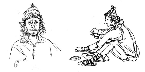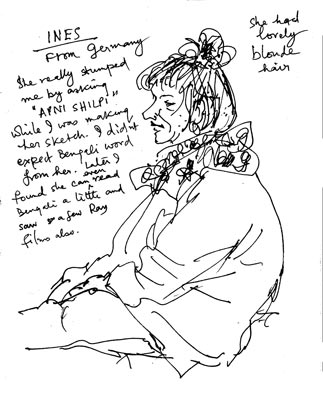 গুটিসুটি হয়ে বসে গল্পগুজব করে, পায়ের কাছে রাখা থাকে জ্বলন্ত কয়লা ভরা বড় কাংড়ি। আলো বলতে বাইরের চালা থেকে ঝুলন্ত একটা টিমটিমে সোলার ল্যাম্প-ঘরের ভেতরটা প্রায় অন্ধকারাচ্ছন্ন, বড় জোর একটা-দুটো মোমবাতি, চোরাগোপ্তা হাওয়ার চোটে যেগুলো বেশি ক্ষণ জ্বালিয়ে রাখা অসম্ভব। ইংরেজ মেয়ে অ্যানি শোনায় ভারত ভ্রমণে এসে ওর নানা মজার অভিজ্ঞতার কথা। আমার পাশের গোলগাল আইরিশ মেয়েটি সুরেলা কন্ঠে গান গেয়ে ওঠে কান্ট্রি সং। এত ক্ষণ চুপচাপ বসে সবার স্কেচ করছিলাম, এ বার আমিও শুনিয়ে দিই ওদের সুর থেকে নেওয়া রবি ঠাকুরের ‘কতবার ভেবেছিনু আপনা ভুলিয়া...’। এই গলায় গান...ঘোরতর আস্পর্ধা বটে। তা-ও শেষে দেখলাম হাততালি দিল সবাই। জার্মানির ‘বন’ শহর থেকে আইনিস এসেছে এক বেজায় ঢ্যাঙা আমেরিকান ছেলে বন্ধুকে নিয়ে, যার পাশে হাঁটাচলা করতে গিয়ে আমাদের ছ’ফুটিয়া অভিজিতেরও কিঞ্চিৎ অস্বস্তি হচ্ছিল। দু’জনের আলাপ লন্ডন এয়ারপোর্টে। কিছু দিন একসঙ্গে ঘুরে ট্যুরে যে যার মতো ঘরে ফিরে যাবে। ছেলেটি মুখচোরা, প্রায় নাক অবধি ঢেকে সারা ক্ষণ শুধু ঝিমোচ্ছিল। অন্য দিকে, আইনিস তুমুল আড্ডাবাজ, ওর ছবিটা দেখে পরিষ্কার বাংলায় বলল, ‘‘আপনি শিল্পী?’’ আমি তো অবাক, পরে জানলাম ও বাংলা পড়তেও পারে, এমনকী, সত্যজিৎ রায়ের বেশ কয়েকটা সিনেমাও দেখেছে।