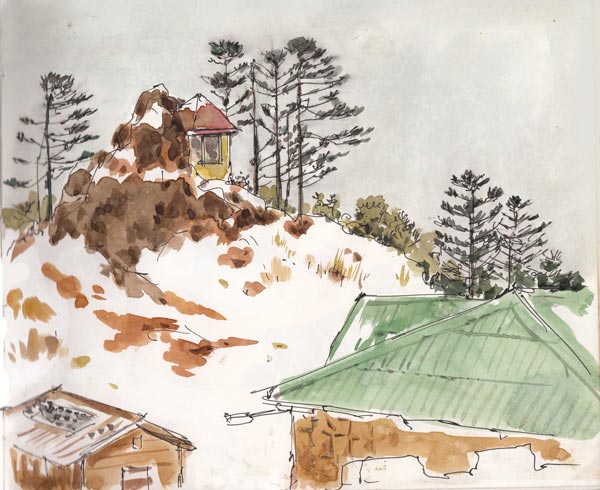বরফ ঢুকে এখানে ওখানে স্তূপ হয়ে রয়েছে। তবে সব থেকে বেগ পেয়েছিলাম ছবি আঁকতে গিয়ে। বাইরে তো বেরোতেই পারছি না, ঝড়ের বেগে এমন বরফ গলানো হাওয়া সারাক্ষণ। খোলা জায়গায় জমে যাওয়ার মতো অবস্থা, এত ঠান্ডা! স্পোর্টসম্যান অর্ণব এ দিকে গোটা দিন অসুস্থ হয়ে বিছানায়, সায়নও বেচারা জবুথবু হয়ে রান্নাঘরের উনুনের সামনে থেকে নড়তেই চাইছেন না। প্রেম শর্মা ওঁকে ঘণ্টায় ঘণ্টায় ফুটন্ত চা খাইয়ে যাচ্ছে। বললাম, ‘‘বরফ বরফ করে তো লাফাচ্ছিলি, এখন বোঝ!’’ আমি নিজে এখন মরিয়া, বরফে ঢাকা সান্দাকফু-র দৃশ্য আঁকা হবে না? দুগ্গা বলে বসে গেলুম রং-তুলি সাজিয়ে যতটা সম্ভব হাওয়াটাকে আড়াল করে। তুলি ধরা হাত বার বার কেঁপে উঠছে...দাঁতে দাঁত লেগে যাচ্ছে, চোখ ঝাপসা...একমাত্র রাজা বাঁ পাশে দাঁড়িয়ে সঙ্গ দিয়ে গেছে, ছেলেটা চিরকাল ওই রকম বেপরোয়া। কী করে যে এঁকে ফেলেছি কয়েকটা ছবি কে জানে। অবশ্য ফিনিশগুলো হয়েছিল ঘরের মধ্যে বসে। এ রকম সুযোগ কি আর রোজ রোজ আসে?