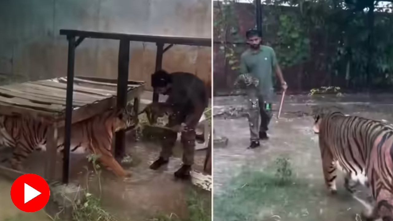 দৃশ্যটা একেবারে সিনেমার মতো। মুষলধারে বৃষ্টি হচ্ছে। বাঘিনীর খাঁচার ভিতরে একটা ছোট লাঠি হাতে দাঁড়িয়ে আছেন এক ব্যক্তি। বৃষ্টির কারণে খাঁচার জায়গায় জায়গায় জমেছে জল। শাবকসমেত বেঞ্চের নীচে আশ্রয় নেওয়া বাঘিনীর পাশ থেকে ঝুঁকে বাঘিনীর ছোট্ট এক শাবককে তুলে নেন তিনি। ধীরে ধীরে এগিয়ে যান খাঁচার ভিতরে থাকা বাঘিনীর ঘরের দিকে। বাঘিনী তার ঠিক পাশেই দাঁড়িয়ে থাকে। কোনও গর্জন নেই, প্রতিরোধ নেই, আক্রমণও নেই! এই হাড়হিম করা দৃশ্যটি ক্যামেরাবন্দি হয়ে সমাজমাধ্যমে ছড়িয়ে পড়েছে। ভাইরাল হয়েছে সেই ভিডিয়োটি। যদিও এই ভিডিয়োটির সত্যতা যাচাই করেনি আনন্দবাজার ডট কম।
