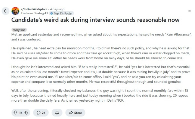 ঊর্ধ্বতনের দাবি, ইন্টারভিউ চলাকালীন তরুণের কোনও জিজ্ঞাস্য রয়েছে কি না তা প্রশ্ন করেছিলেন তিনি। ঊর্ধ্বতনকে অবাক করে দিয়ে সেই তরুণ বলেন, “আমার বর্ষাকালীন ভাতা চাই। যাতায়াতের জন্য খরচ বেশি পড়ছে।” মানবসম্পদ বিভাগের সেই ঊর্ধ্বতন ভাবছিলেন যে, তাঁর সঙ্গে তরুণ মজা করছেন। তাঁর হয়তো চাকরির বিশেষ কোনও প্রয়োজন নেই। সে কারণেই এমন উদ্ভট দাবি করে বসেছেন তিনি।