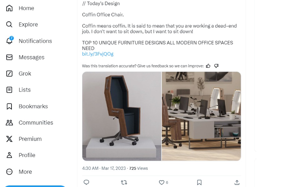 এক্স (সাবেক টুইটার) হ্যান্ডলে ‘আইডিড টিম’ নামের একটি অ্যাকাউন্ট থেকে পোস্ট করা হয়েছে এই চেয়ারের নকশা। বিবরণে চিনা ভাষায় লেখা হয়েছে ‘‘কফিন অফিস চেয়ার।’’ কেন এই নাম? তার ব্যাখ্যা দিয়ে লেখা হয়েছে, ‘‘কফিন মানে কফিন। মৃত্যু শয্যা। এর অর্থ তুমি এমন চাকরি কর যেখানে আর এগনোর কোনও সম্ভাবনা নেই। ভবিষ্যৎ নেই। যে চেয়ারে তুমি বসতে চাও না। কিন্তু তোমাকে বসতেই হয়।’’