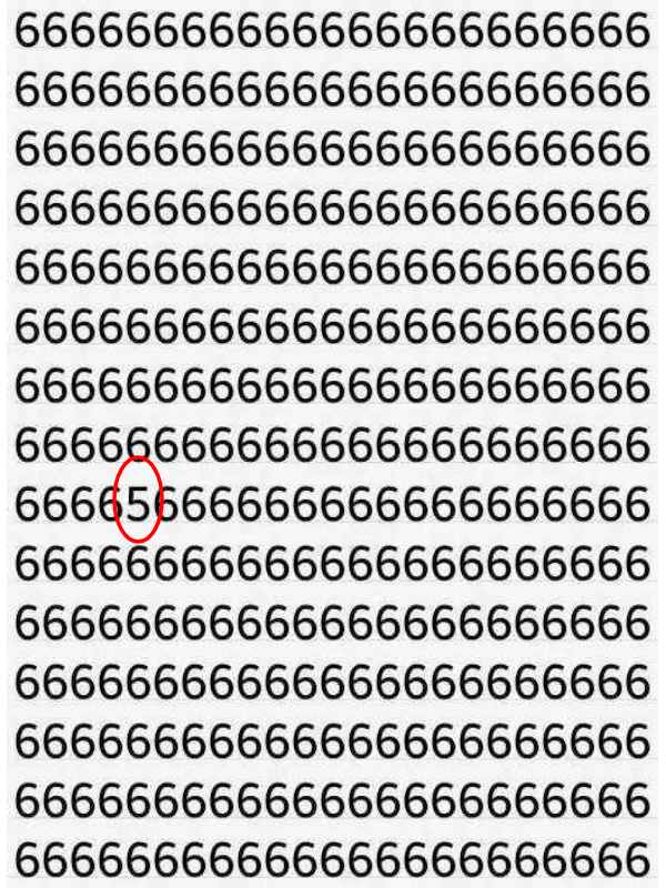 উপরের ছবিতে সারিবদ্ধ ভাবে সাজানো রয়েছে ইংরেজি হরফের ৬ সংখ্যাটি। অজস্র ৬-এর সারি থেকে খুঁজে ফেলতে হবে একটি ৫-কে।