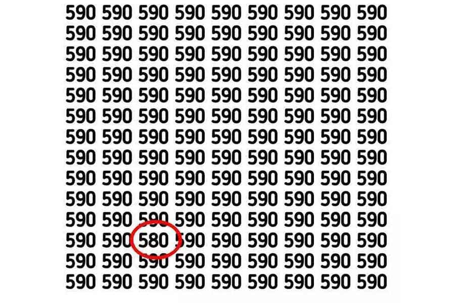 ছবি জুড়ে যে সংখ্যা থরে থরে সাজানো রয়েছে, সেটি হল ৫৯০। পরের পর পংক্তিতে সার দেওয়া সেই ৫৯০ দের ভিড়ে লুকিয়ে আছে একটি ৫৮০। এই সংখ্যাটিকেই খুঁজে বার করতে হবে। আপনি কি ইতিমধ্যেই সংখ্যাটি খুঁজে পেয়ে গিয়েছেন? তাহলে আপনি জিনিয়াস। হয়তো বা অঙ্কপ্রেমীও। কিন্তু না পেলেও চিন্তা নয়। নীচে দেওয়া রইল সমাধান।