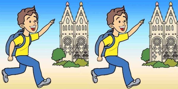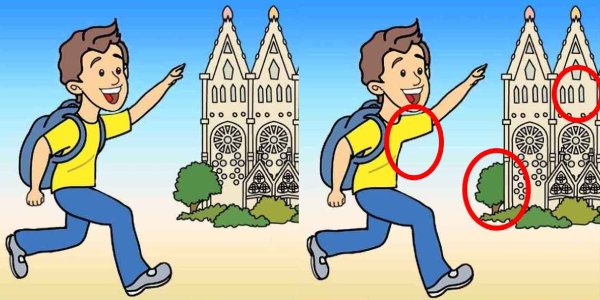 দু’টি ছবিই এক যুবকের। পর্যটক। কাঁধে ব্যাগ।একটি গির্জার সামনে দিয়ে হেঁটে যাচ্ছে সে। পাশাপাশি এই দু’টি ছবিই এক রকমের। কিন্তু তাতে অমিল রয়েছে তিনটি।