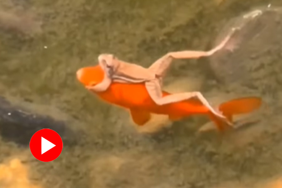 জলের তলায় সাঁতার কেটে এ দিক-ও দিক যাচ্ছিল একটি মাছ। জলের গভীরে সুযোগ পেয়ে সেই মাছের পিঠেই চেপে বসল একটি ব্যাঙ। পিছনের দুই পা ছড়িয়ে মনের সুখে সাঁতার কেটে বেড়াল সে। সমাজমাধ্যমে এমনই একটি মজার ভিডিয়ো ছড়িয়ে পড়েছে (যদিও এই ভিডিয়োর সত্যতা যাচাই করেনি আনন্দবাজার অনলাইন)।