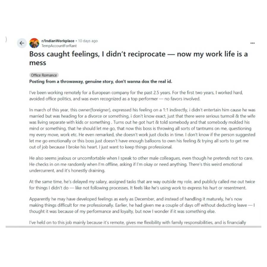 তরুণীর দাবি, তিনি বিবাহিত বসের সঙ্গে পরকীয়া সম্পর্কে জড়ানোর প্রস্তাব ফিরিয়ে দিয়েছিলেন। সে কারণেই তরুণীর কর্মজীবন অসহনীয় করে তুলতে চাইছেন তাঁর ঊর্ধ্বতন। সমাজমাধ্যমের পাতায় এই ঘটনার উল্লেখ করে পোস্ট করেছেন তরুণী (যদিও তার সত্যতা যাচাই করেনি আনন্দবাজার ডট কম)।