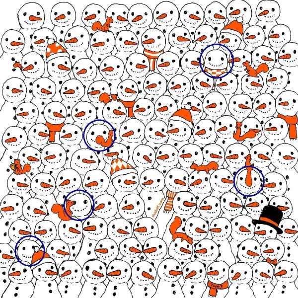 এই ছবিতে খুঁজে বের করতে হবে সেই পাঁচজনকেই। তবে সময় বেঁধে দেওয়া হয়েছে ১৫ সেকেন্ড। খুঁজতে একটু অসুবিধা হতে পারে। কারণ তুষার মানবদের ঘাড়ে পিঠে খেলে বেড়াচ্ছে কমলা রঙের কাঠ বেড়ালি। তাদের কেউ কেউ চড়ে বসেছে নাকের উপরেও। আবার কিছুটা ষড়যন্ত্র করেই সম্ভবত তুষার মানবদের মাফলার আর টুপিও পরানো হয়েছে কমলা রঙেরই। তাতে পাঁচ নাকবিহীন তুষার মানবকে খুঁজতে সামান্য অসুবিধা হতে পারে। যাঁরা পাবেন না, তাঁদের জন্য সমাধান রইল নীচে।