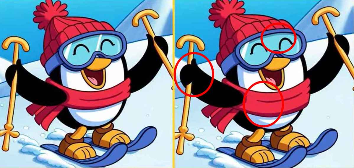 ছবি দুটি তুষার রাজ্যে স্কি করতে ব্যস্ত এক পেঙ্গুইনের। বরফের মজা তাড়িয়ে তাড়িয়ে উপভোগ করছে সে। তার চোখে স্কি করার রোদ চশমা। মাথায় লাল উলের টুপি। গলায় টুকটুকে লাল গরম মাফলার। আনন্দে দু'হাত তুলে হাসছে ওই পেঙ্গুইন। আপাত দৃষ্টিতে হুবহু এক এই দুটি দৃশ্যেই লুকিয়ে তিনটি পার্থক্য।