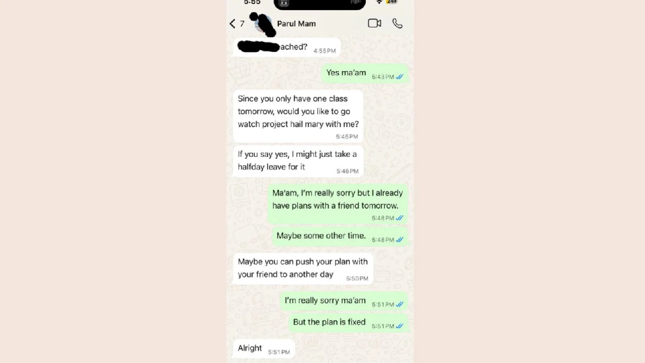 স্ক্রিনশটে দেখা গিয়েছে, শিক্ষিকা ছাত্রকে মেসেজ করে বলছেন, “যেহেতু আগামী কাল তোমার মাত্র একটি ক্লাস আছে, তুমি কি আমার সঙ্গে ‘প্রজেক্ট হেইল মেরি’ দেখতে যাবে?” তিনি আরও যোগ করেন, “যদি তুমি হ্যাঁ বলো, তা হলে আমি হয়তো এর জন্য হাফ ডে ছুটি নিয়ে নেব।” শিক্ষিকার প্রস্তাবে ছাত্রকে নম্র ভাবে উত্তর দিতে দেখা গিয়েছে সেই মেসেজে। ছাত্রটি লিখেছেন, “ম্যাডাম, আমি সত্যিই দুঃখিত। কিন্তু আগামী কাল আমার এক বন্ধুর সঙ্গে আগে থেকেই পরিকল্পনা করা আছে।” শিক্ষিকা যখন তাঁকে পরিকল্পনাটি পরিবর্তন করার পরামর্শ দেন, তখন ছাত্র উত্তর দেন, “আমি সত্যিই দুঃখিত ম্যাডাম। কিন্তু আগে থেকেই একটি পরিকল্পনা ঠিক হয়ে গিয়েছে।” শিক্ষিকার “ঠিক আছে” বলার মাধ্যমে কথোপকথনটি শেষ হয়।