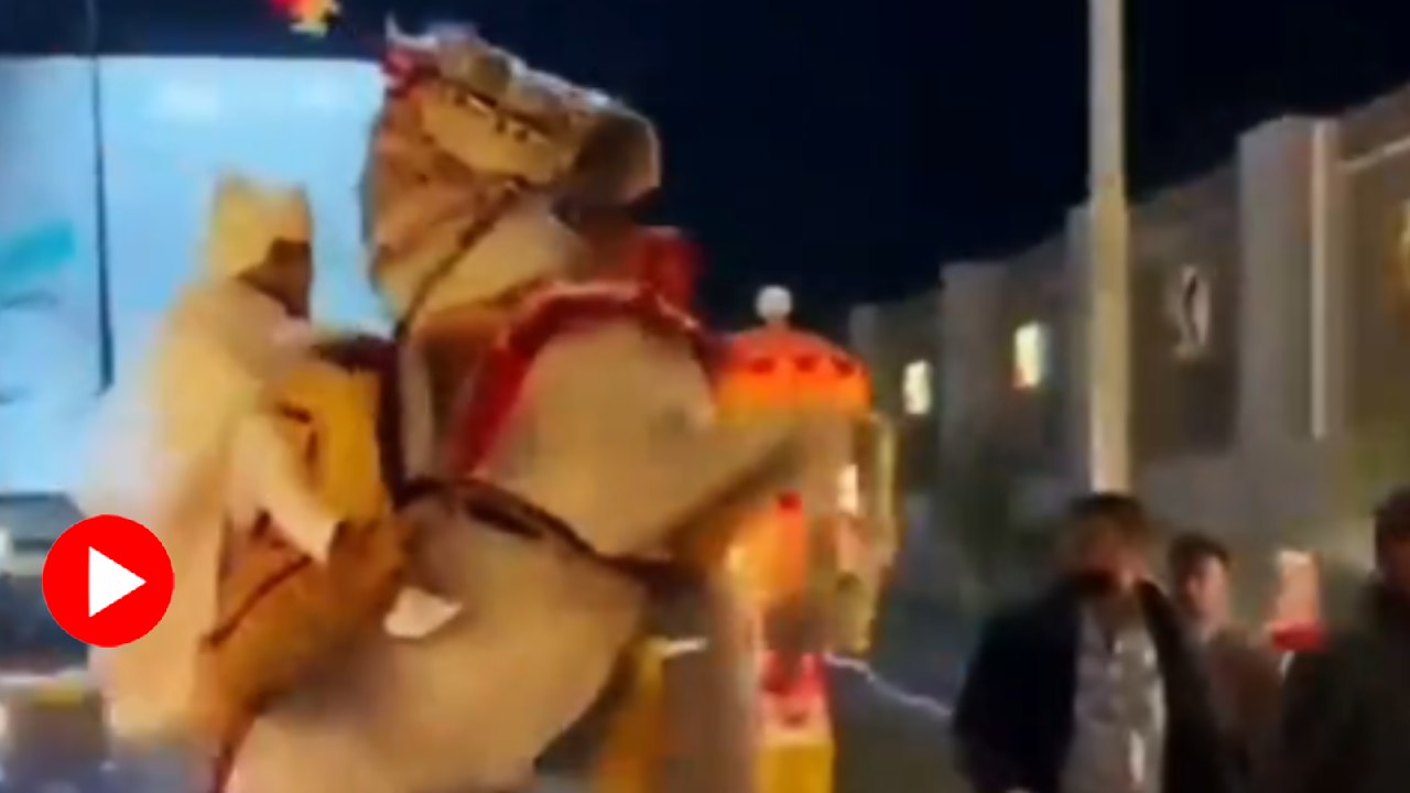 ‘ভারতীয়ইনলাস্ট২৪এইচআর’ নামের অ্যাকাউন্ট থেকে ইনস্টাগ্রামের পাতায় একটি ভিডিয়ো পোস্ট করা হয়েছে। সেই ভিডিয়োয় দেখা গিয়েছে যে, একটি ঘোড়ার পিঠে বরের সাজে বসে রয়েছেন এক তরুণ। তরুণকে পিঠে তুলে পিছনের দু’পায়ে খাড়া হয়ে মানুষের মতো হেঁটে হেঁটে অনুষ্ঠানগৃহের দিকে এগিয়ে যাচ্ছে ঘোড়াটি। পাছে হবু স্ত্রী এবং অনুষ্ঠানভর্তি অতিথিদের সামনে নাক কাটা যায়, সেই ভয়ে ঘোড়াটিকে জড়িয়ে ধরে বসেছিলেন পাত্র।
