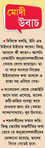 গত সপ্তাহে শ্রীরামপুরের সভায় মোদী বলে গিয়েছিলেন, “১৯৪৭ সালের পরে যাঁরা ভারতে এসেছেন, তাঁরা বিছানা-বেডিং বেঁধে রাখুন। ১৬ মে-র পরে তাঁদের বাংলাদেশে ফিরে যেতে হবে।”