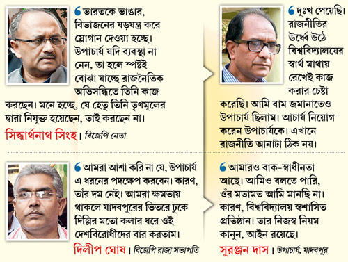 উপাচার্যের পাশে দাঁড়িয়েছে শিক্ষকমহলও। যাদবপুর বিশ্ববিদ্যালয়ে ইংরেজি বিভাগের এমেরিটাস অধ্যাপক সুকান্ত চৌধুরী বলেন, ‘‘যদি কোনও স্লোগান দেওয়া হয়ে থাকে, তবে কর্তৃপক্ষ বিষয়টি দেখবেন। কোনও রাজনৈতিক দল অনর্থক বিতর্ক তৈরি করে বিশ্ববিদ্যালয়কে অশান্ত করতে চাইলে তা নিন্দনীয়।’’ রবীন্দ্রভারতী বিশ্ববিদ্যালয়ের প্রাক্তন উপাচার্য পবিত্র সরকারের মতে, ‘‘যাদবপুরের উপাচার্য সম্মানযোগ্য কাজ করেছেন। তাঁকে এ ভাবে আক্রমণ করাটা জঘন্য কাজ।’’ যাদবপুরের প্রাক্তন উপাচার্য অশোকনাথ বসুর প্রতিক্রিয়া, ‘‘এটা অপরাধমূলক কাজ।’’