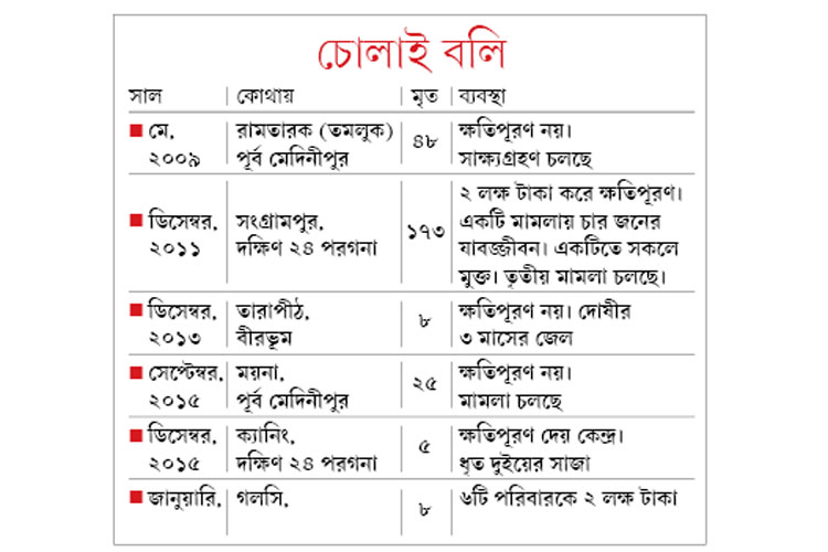 সূত্রের খবর, মঙ্গলবার বিকেল থেকে সন্ধ্যার মধ্যে বেশ কিছু মহিলা-পুরুষ চৌধুরীপাড়ায় চন্দনের বাড়িতে চোলাই মদ খেয়েছিলেন। রাত থেকেই তাঁরা অসুস্থ হয়ে পড়তে থাকেন। পেটে জ্বালা, সঙ্গে বমি। অসুস্থ ছ’জনকে কালনা মহকুমা হাসপাতালে নিয়ে যাওয়া হয়। সেখানেই মারা যান ভুটান মাহাতো (২৫), সুনীল মাহাতো (৩০) ও কাশীনাথ মাহাতো (৪০)। মৃত অবস্থাতেই শান্তিপুরের হাসপাতালে আনা হয় দুলাচাঁদ মাহাতোকে (৪৫)। সেখানেই পরে মারা যান গৌতম শর্মা (২০) এবং মুন্না রায় (২৮)। ভালোয়া মাহাতো (৬০) আনাজ নিয়ে ট্রেন ধরেছিলেন। বালি স্টেশনে অচৈতন্য অবস্থায় পাওয়া যায় তাঁকে। হুগলির উত্তরপাড়া স্টেট জেনারেল হাসপাতালে নিয়ে যাওয়া হলে রাতে তাঁর মৃত্যু হয়। মৃতদের মধ্যে একমাত্র তিনিই মহিলা। বুধবার সন্ধ্যায় শান্তিপুর থেকে কৃষ্ণনগরে জেলা হাসপাতালে নিয়ে যাওয়ার পথে মারা যান বাসুদেব মাহাতো (৪৯)। রাতে কল্যাণী হাসপাতালে মারা যান চন্দন এবং তাঁর ভাই লক্ষ্মী মাহাতো (২৮)।