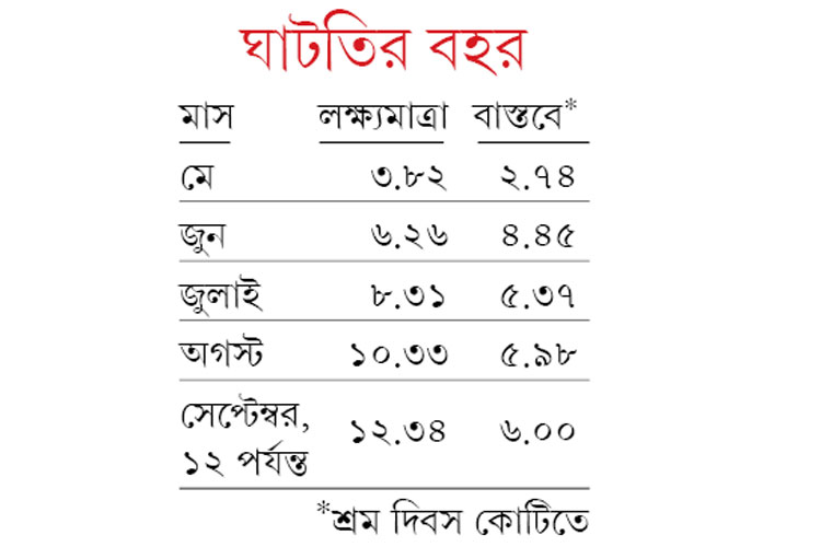 মে মাসে চুকে গিয়েছে লোকসভা ভোটের কর্মকাণ্ড। তার পরে চার মাসেও রাজ্যে গতি পায়নি ১০০ দিনের কাজ প্রকল্প। গত কয়েক বছরে ধারাবাহিক ভাবে প্রতি মাসে কর্মদিবস তৈরির যে-লক্ষ্যমাত্রা রাখা হত, তার চেয়ে খানিকটা বেশিই কাজ করে দেখাত বাংলা। ভোটের পরে ছবিটা কিন্তু ঠিক উল্টো। সেপ্টেম্বরকে ধরে পরপর পাঁচ মাস লক্ষ্যমাত্রা পূরণ করতে পারছে না পশ্চিমবঙ্গ।