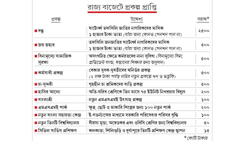 নতুন যে ১১টি প্রকল্পের কথা এ দিন অর্থমন্ত্রী ঘোষণা করেছেন, সেগুলির মূল লক্ষ্য চা-বাগান, তফসিলি জাতি-জনজাতি এবং সীমান্ত ঘেঁষা মতুয়া প্রভাবিত এলাকাগুলি। বিরোধীদের মতে, গত লোকসভা ভোটে এই এলাকাগুলিতেই তৃণমূল ধরাশায়ী হয়েছে। এই সব প্রকল্প ঘোষণা হারানো ভোট ব্যাঙ্ক উদ্ধারের মরিয়া চেষ্টা। সেই কারণেই তফসিলি জাতি ও জনজাতির বয়স্কদের জন্য মাসিক এক হাজার টাকা পেনশন, চা-বাগানে ঘর তৈরি বা মতুয়া গুরু হরিচাঁদ গুরুচাঁদের নামে বিশ্ববিদ্যালয় গড়ার কথা বাজেটে বলা রয়েছে।
