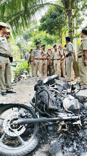 পাঁচু মণ্ডলের পোড়া মোটরবাইক। ঘটনাস্থলে গিয়ে পরিস্থিতি খতিয়ে দেখছেন জেলার পুলিশ সুপার প্রবীণকুমার ত্রিপাঠী।